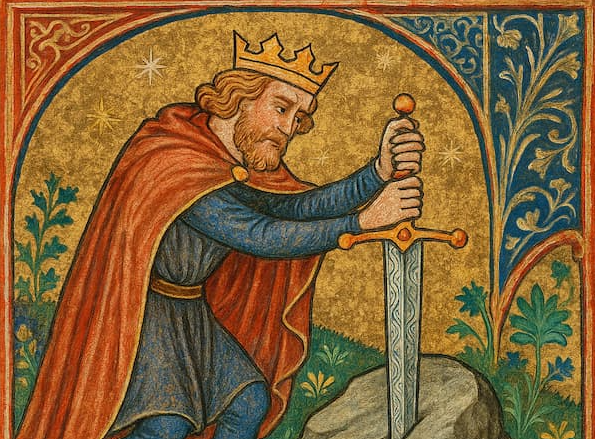Excalibur, l'épée forgée par l'enchanteur Merlin est scellée dans le roc. Elle est arrachée par le jeune Arthur, qui accède à la souveraineté. La quête du Graal peut commercer ...